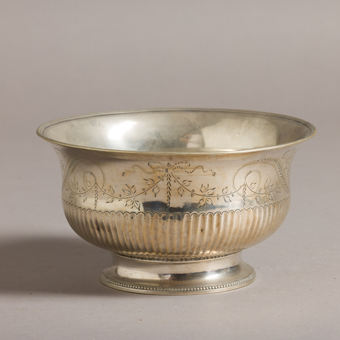 Em prata portuguesa Séc. XVIII/XIX marca do ensaiador do Porto (P-16) José Coelho Sampaio e de ourives (P-483) datável c.de 1790-1810, decoração gravada com grinaldas e caneluras, monogramada. Sinais de uso e amolgadelas.