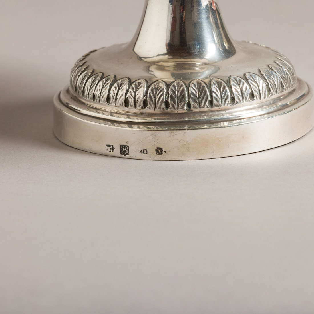 Em prata portuguesa do Séc. XIX, remarcada águia (1938-1984) de 833, decoração relevada com grinaldas e "cabeças de Baco", pomo "parras e uvas", pega em madeira exótica Sinais de uso.