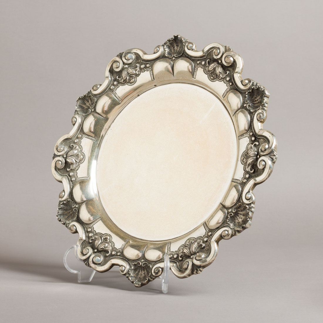 Em prata portuguesa contraste águia (1938-1984) de 833, decoração relevada aba "enrolamentos e concheados". Sinais de uso.