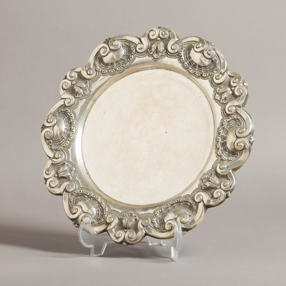 Em prata portuguesa contraste águia (1938-1984) de 833, decoração aba relevada "enrolamentos e concheados". Sinais de uso e pequenas amolgadelas.