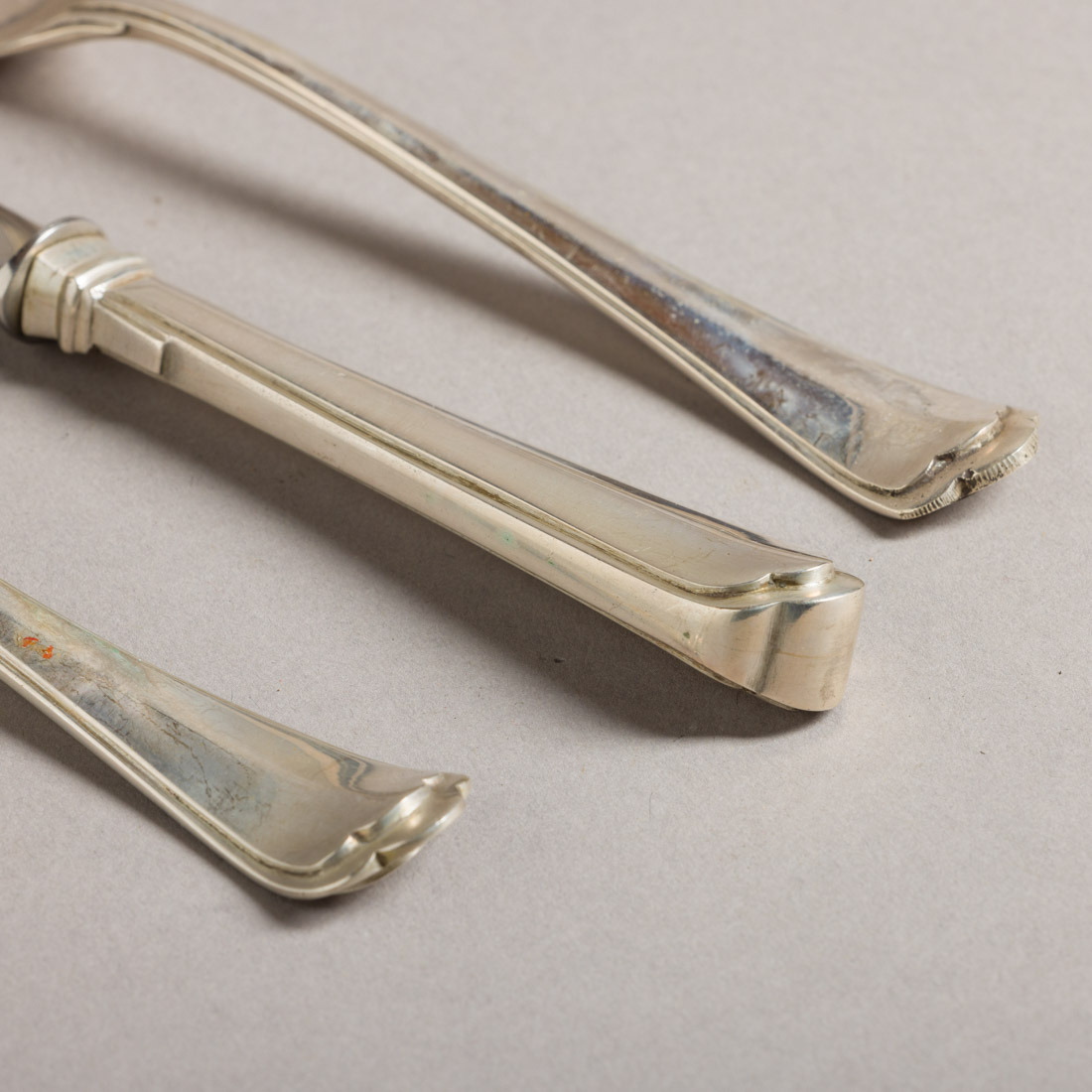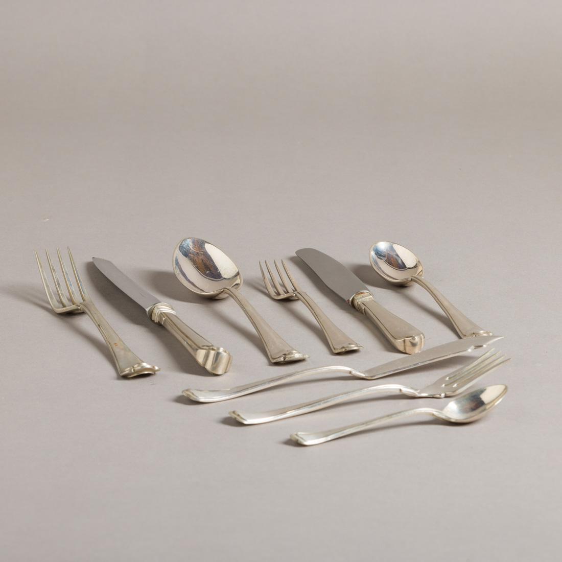 Moldura em prata portuguesa contraste águia (1938-1984) de 833, algumas sem marca, decoração relevada. Composto por talheres de carne, de peixe, de sobremesa, colheres de sopa, sobremesa, de chá e concha de açúcar. Sinais de uso. Peso total aprox.: 6725g.
