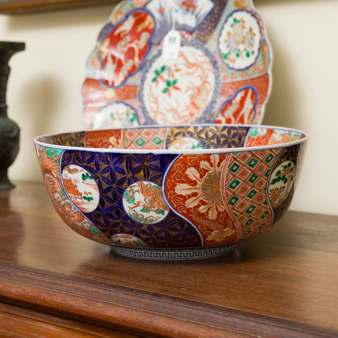 Em porcelana do Japão, decoração "Imari" policromada e dourada com flores, dragões e reservas com paisagens e pássaros. Sinais de uso.