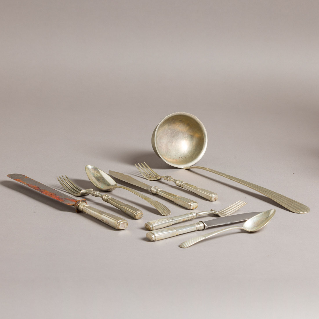 Em prata portuguesa Séc. XIX/XX marca de diferentes ensaiadores e ourives do Porto, decoração "caninhas" Composto por talheres de carne, de peixe, sobremesa, 17 colheres de sopa, sobremesa e faca trinchante de carne. Acompanha concha em alpaca. Laminas com oxidações.
