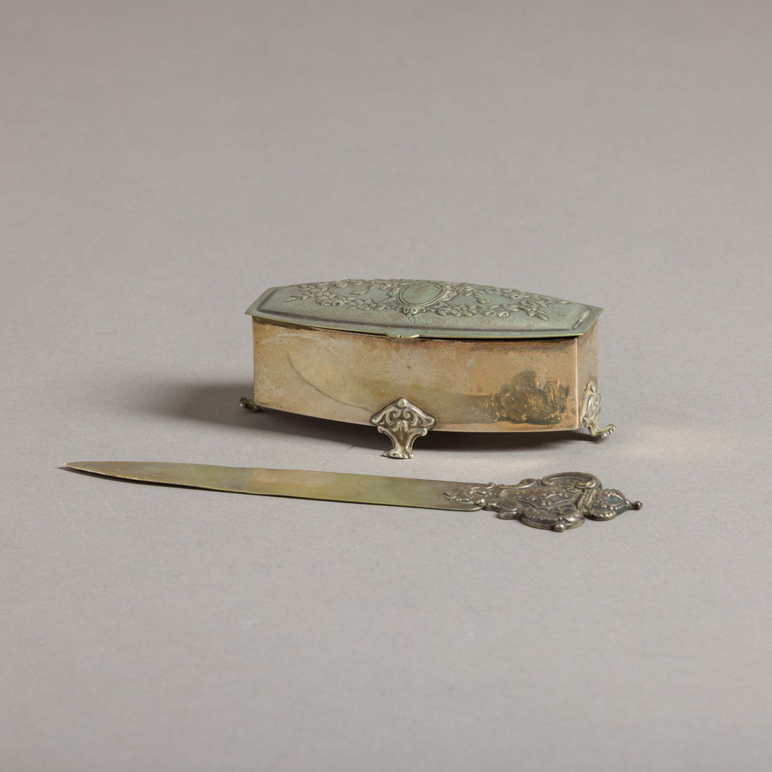 Em prata portuguesa contraste águia (1938-1984) de 833, decoração relevada. Sinais de uso abre cartas com amolgadelas.