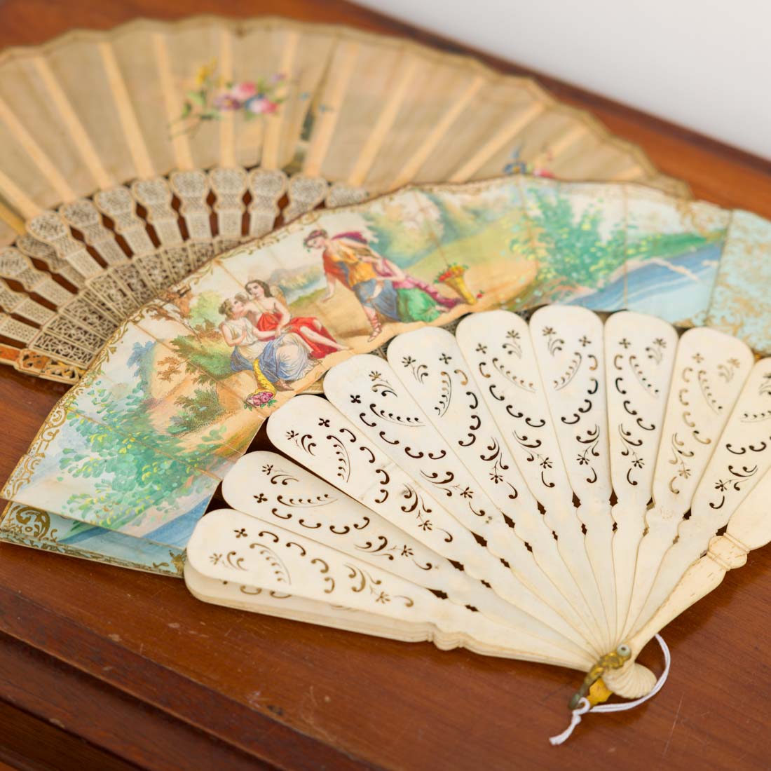 Varetas em osso esculpido, recortado, vazado, prateado e dourado com aplicações em latão relevado e dourado, com espelho, abas em papel e seda "paisagem com figuras". Europa; Séc. XIX. Pequenos defeitos.
