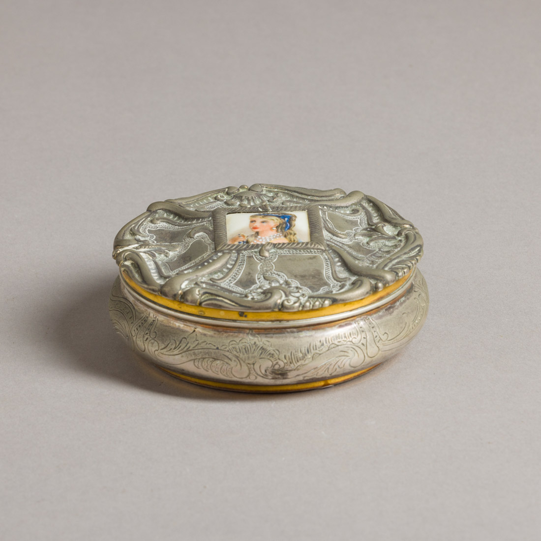 Em prata portuguesa contraste águia (1938-1984) de 833, decoração relevada e gravada "enrolamentos e concheados", tampa com esmalte policromo de Limoges "Figura feminina". Sinais de uso e pequenas amolgadelas.