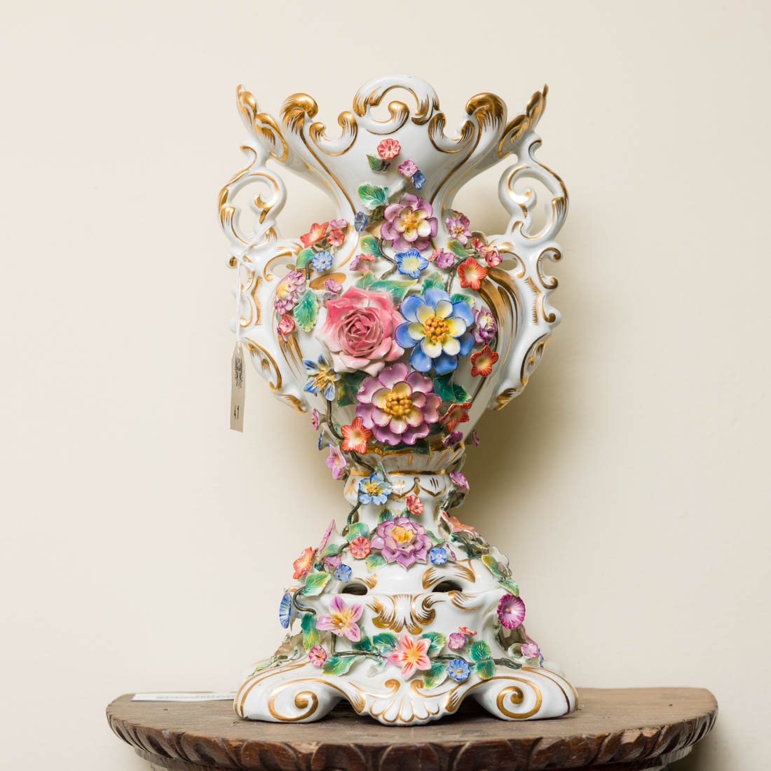 Em porcelana moldada, decoração policromada e dourada com flores em relevo. Europeia, ao gosto Meissen. Pequenas falhas.