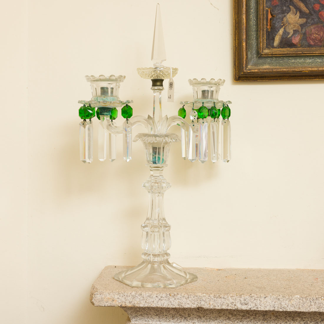 Em cristal e vidro moldado e lapidado com pingentes a verde e a incolor. Faltas e pequenos defeitos.