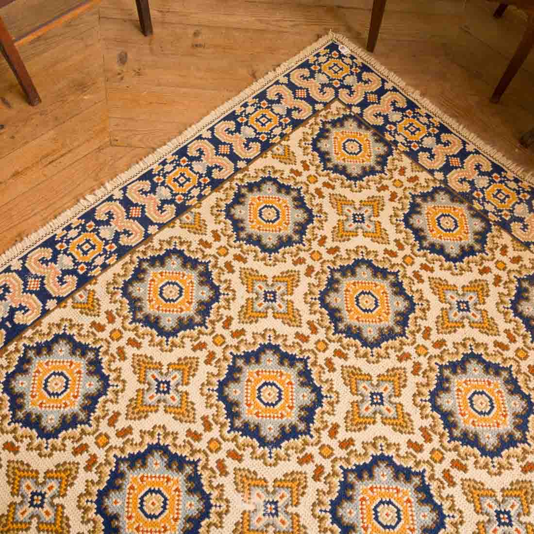 Bordado a fio de lã, decoração policromada "elementos geométricos". Sinais de uso e pequenos defeitos.