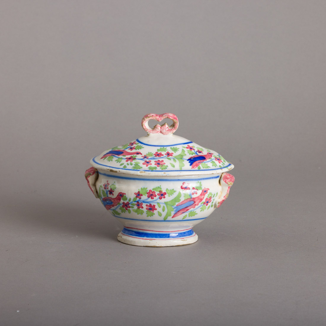 Em faiança portuguesa, decoração policromada "perdizes e flores". Séc. XIX. Desgaste no vidrado e esbeiçadelas.