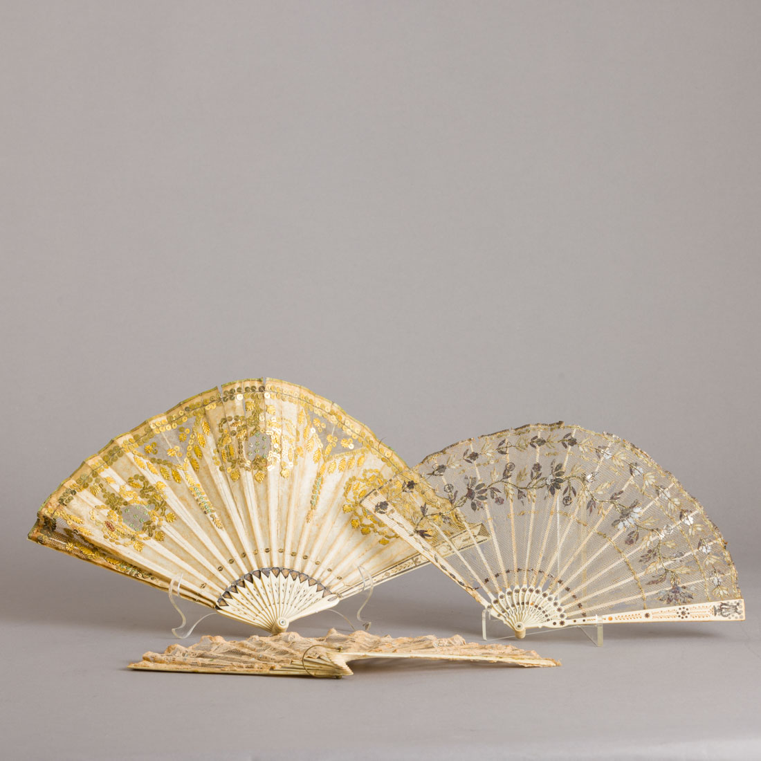 Varetas em osso gravado e vazado, prateado e dourado, aba em seda, rendas e aplicação de lantejoulas. Europa, Séc. XIX. Pequenas falhas e defeitos.