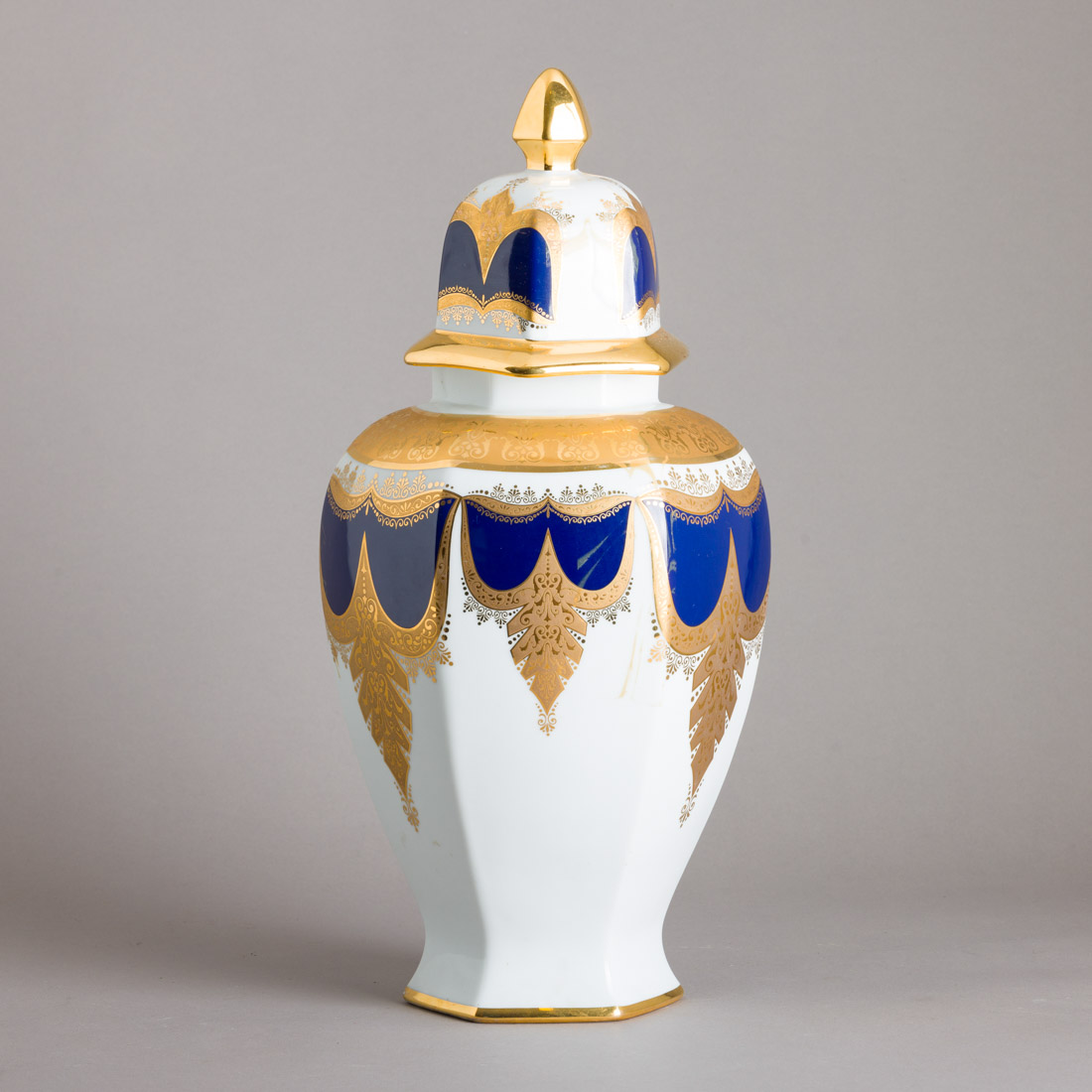 Em porcelana moldada, decoração a azul e a dourado. Europa, Séc. XX. Sinais de uso.