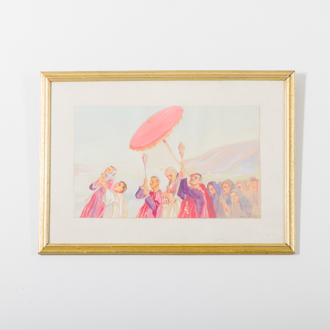 Aguarela sobre papel, assinada e datada 1940. No verso dedicatória. Leves picos de acidez e levemente ondulado.