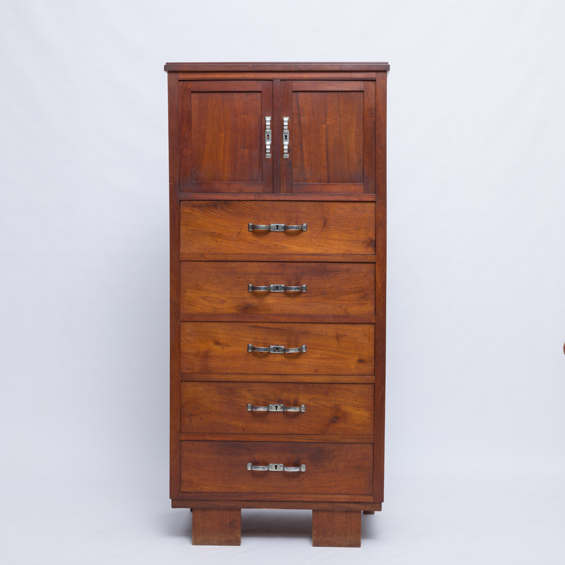Estilo Arte Nova, em madeira, de cinco gavetas e duas portas, puxadores em metal prateado. Sinais de uso e pequenos defeitos.