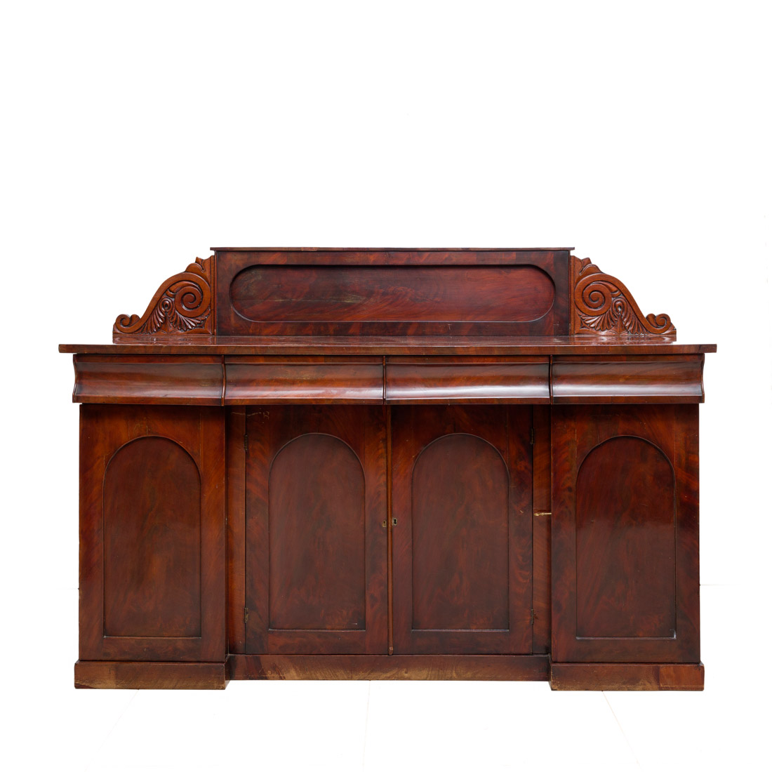 Em mogno e folheado a mogno, de quatro portas e quatro gavetas, alçado com entalhamentos. Pequenas falhas e defeitos.