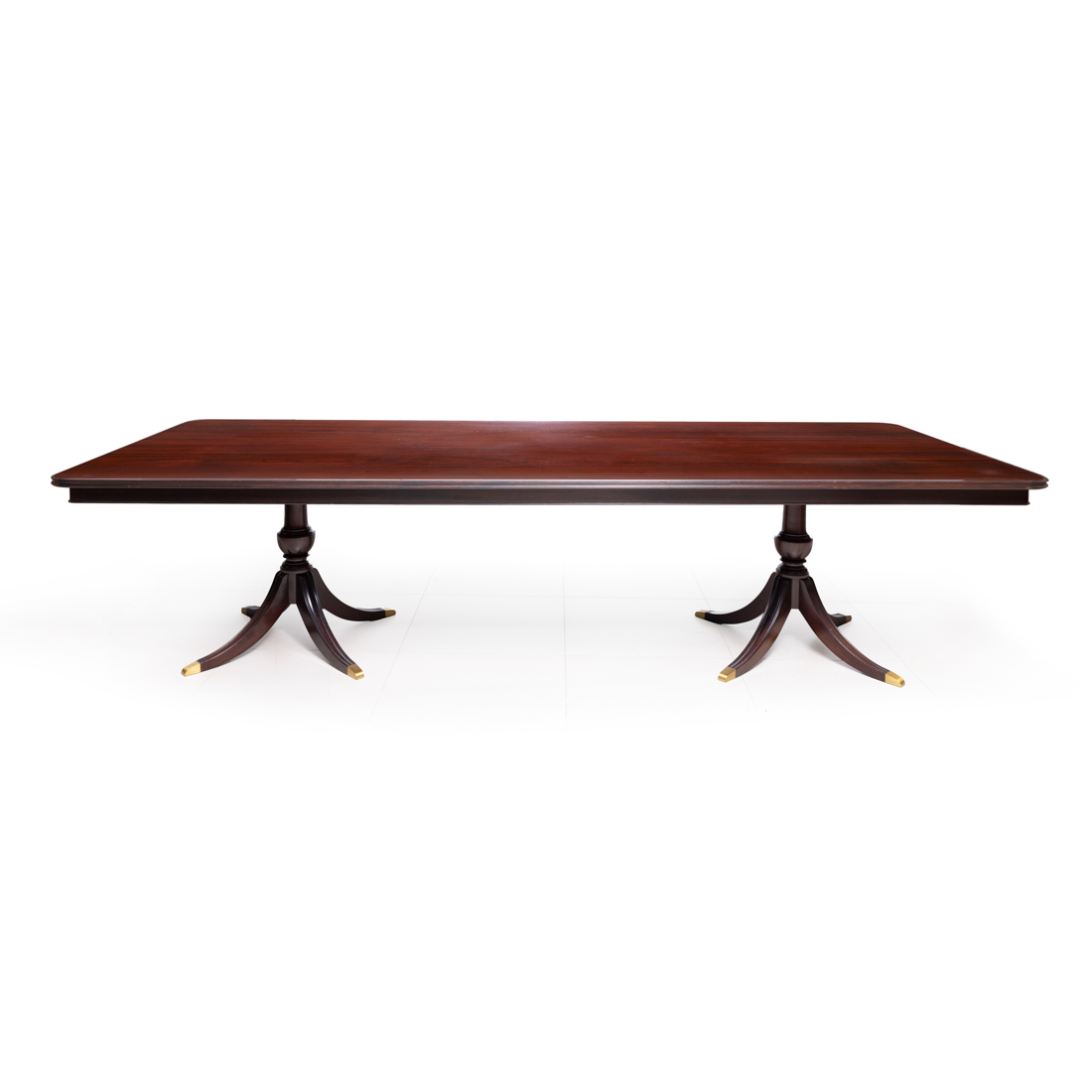 Em mogno, de dupla coluna corneada, pernas gomadas com ponteiras em metal amarelo, cadeiras estilo D. Maria em mogno com entalhamentos, espaldares elípticos com tabela central entalhada e vazada. Sinais de uso e pequenos defeitos. Dim.: 75x300x120,5 cm.