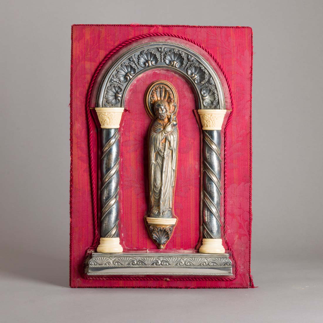 Em prata e marfim, decoração relevada com concheados, elementos torneados e encordoados, assente sobre placa em madeira revestida a seda adamascada. Sem marcas, ao abrigo do Decreto-Lei n.º 120/2017. Pequenos defeitos.