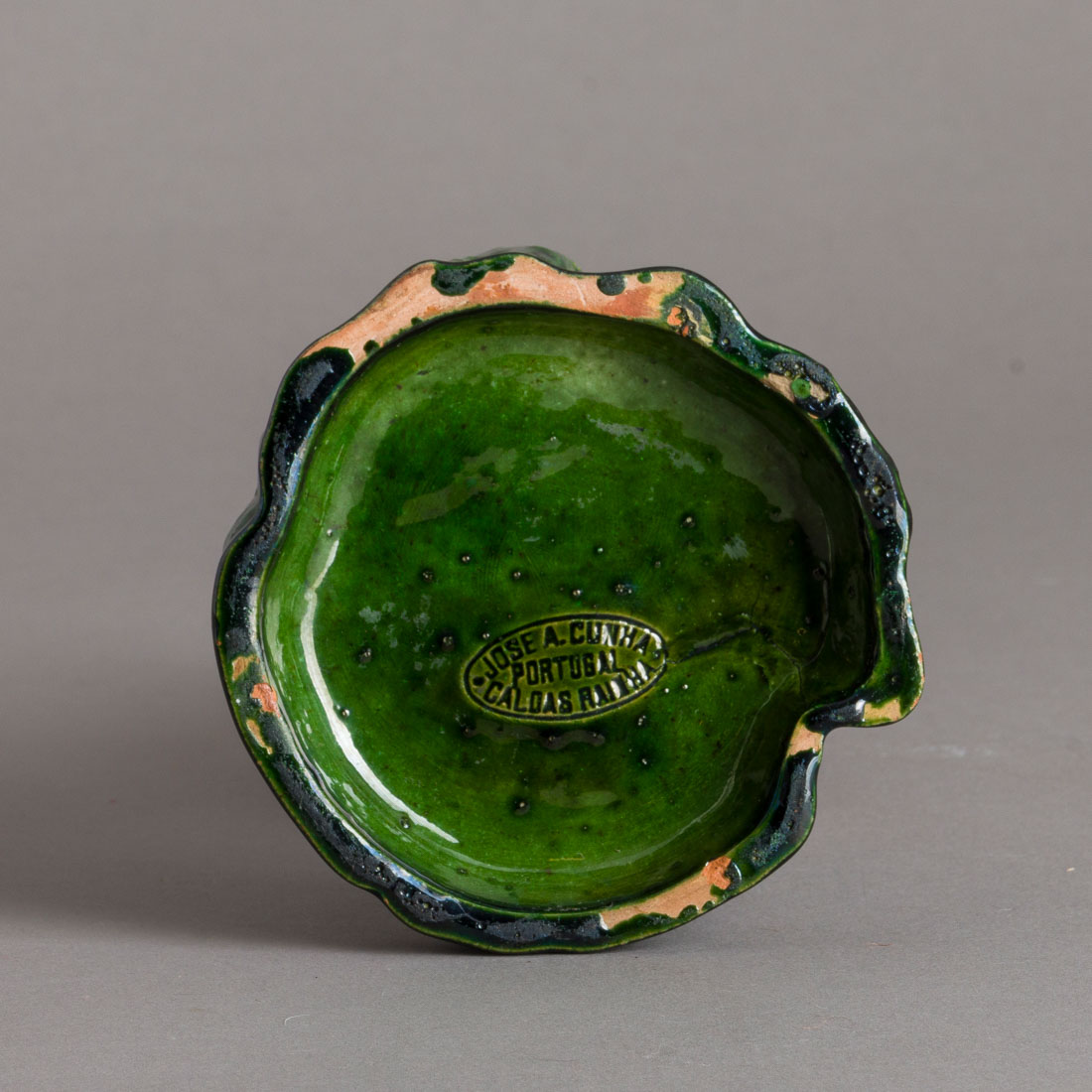 Escultura em cerâmica das Caldas, parcialmente vidrada, decoração policromada. Marcada José A. Cunha. Sinais de uso, ínfimas esbeiçadelas.