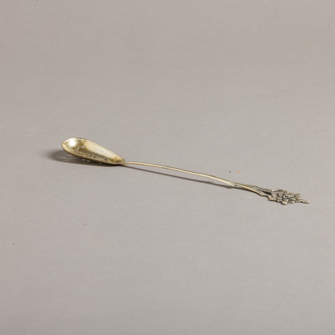 Em prata portuguesa contraste javali (1887-1937) de 833, decoração relevada "flores", parcialmente dourada. Sinais de uso.