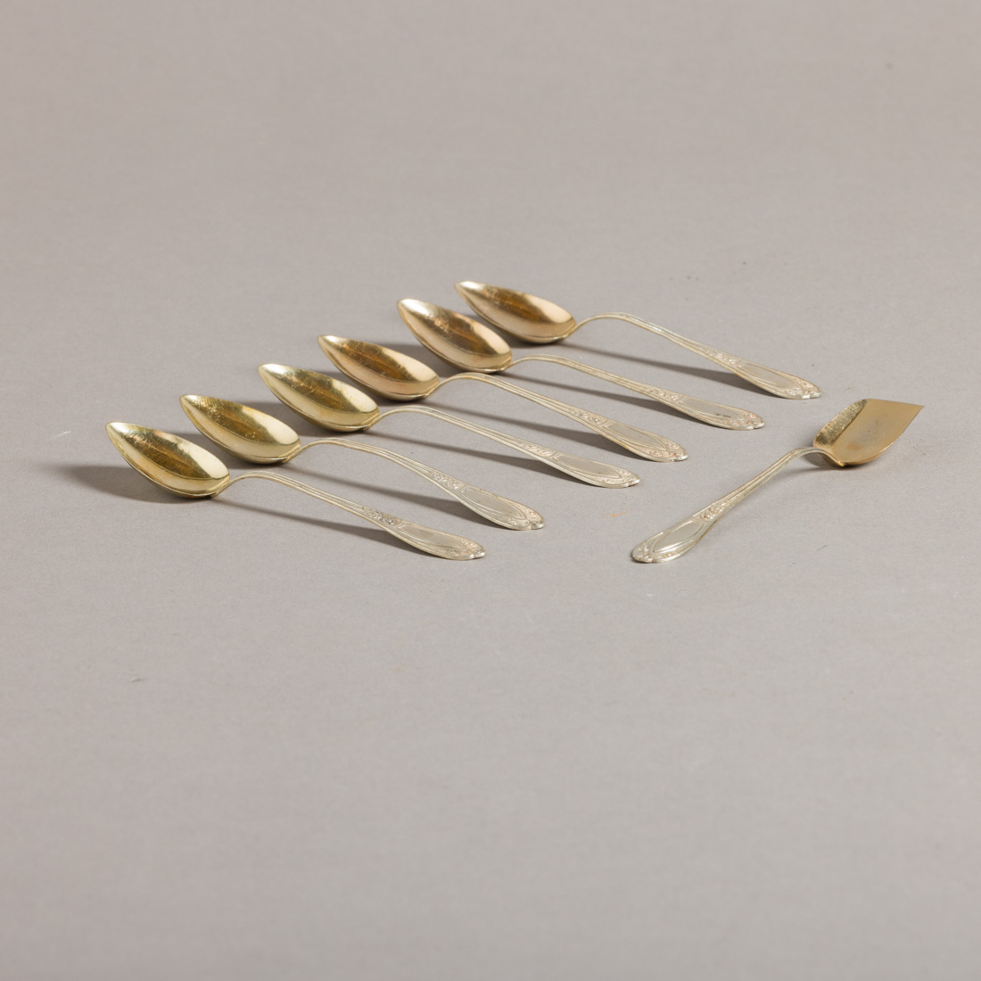 646. CONJUNTO DE SEIS COLHERES DE CAFÉ E CONCHA DE AÇÚCAR