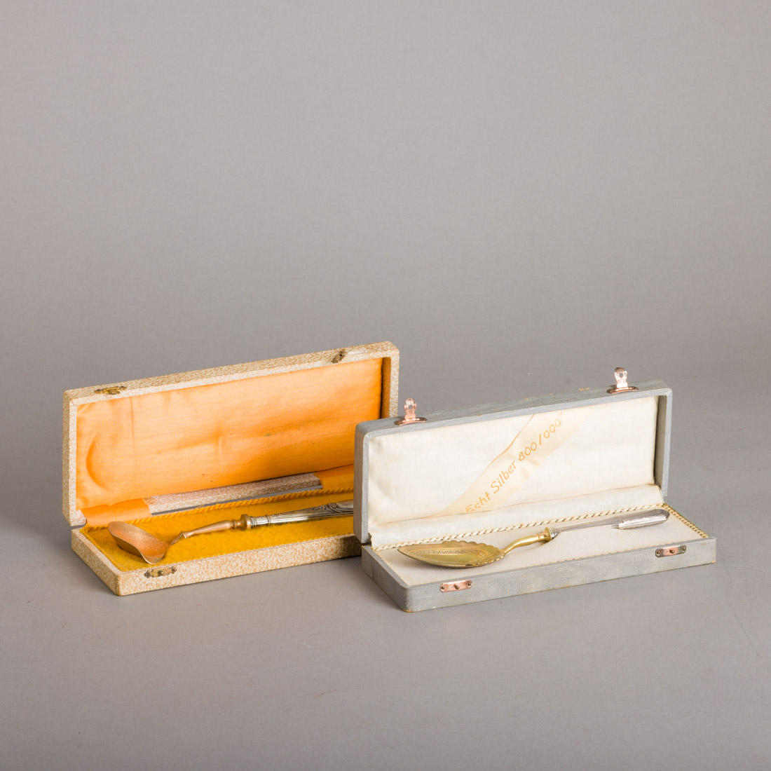 Cabos em prata portuguesa contraste javali (1887-1937) de 833, decoração relevada. Em estojo. Sinais de uso.