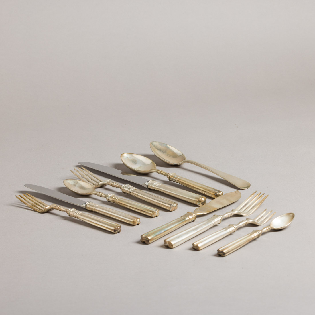 Em prata portuguesa contraste águia (pós 1985) de 835, decoração "Lisboa". Composto por 13 garfos e 13 facas de carne, 6 garfos e 6 facas de peixe, 6 garfos e 6 facas de sobremesa, 10 colheres de sopa, 6 de sobremesa, 12 de chá e 12 garfos de bolo, acompanha 2 colheres de sopa decoração lisa. Sinais de uso.