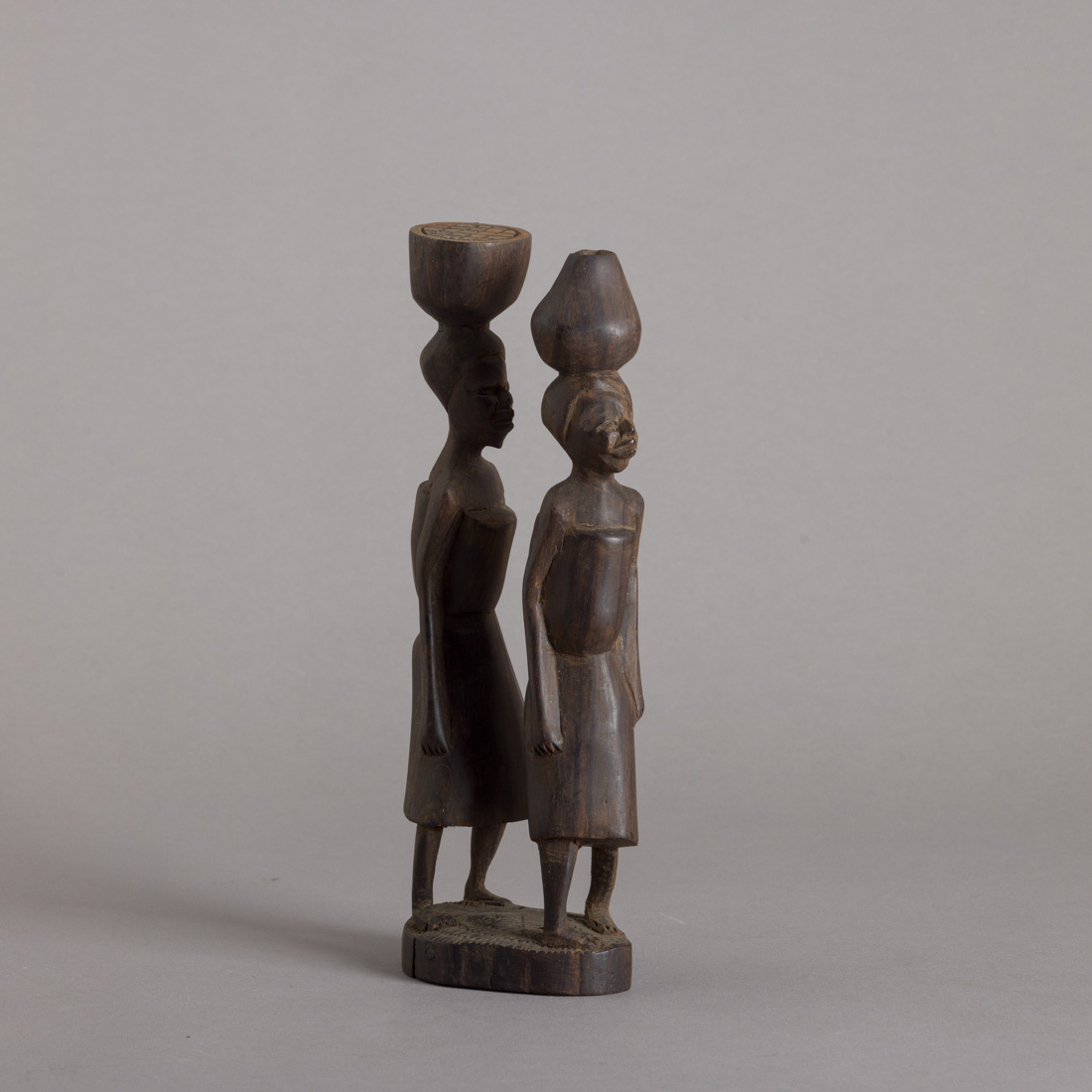 Grupo escultórico em madeira, Africa. Sinais de uso, fissura na base.