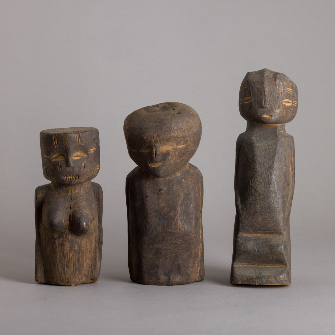 Esculturas em madeira patinada, Africa. Sinais de uso, pequenos defeitos de xilófagos.