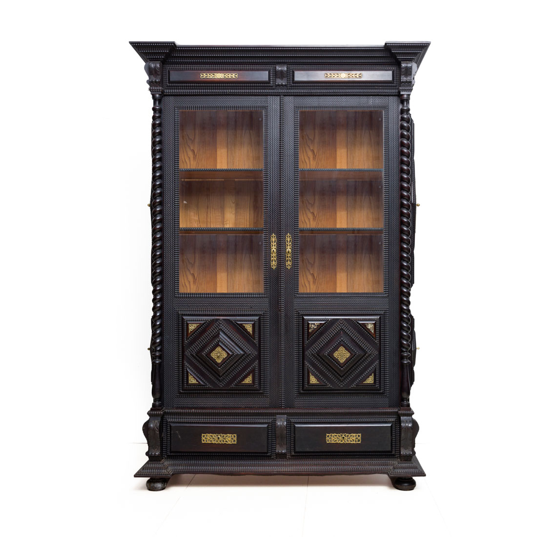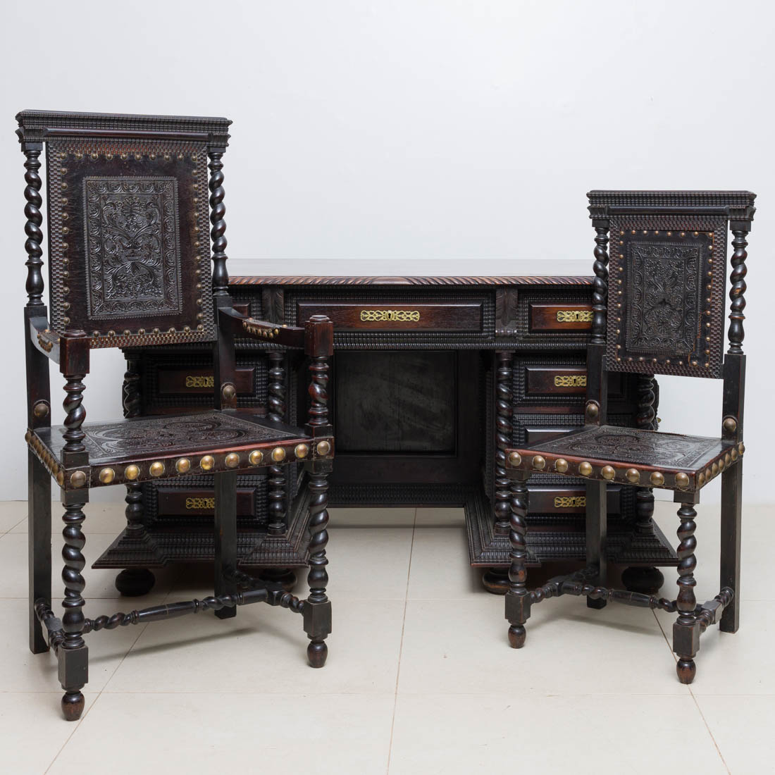 Em pau santo e folheado a pau santo, decorada com almofadas e frisos de tremidos, colunas espiraladas. Composto por secretária, livreira, cadeirão e cadeira com assentos em couro lavrado. Falhas e pequenos defeitos.