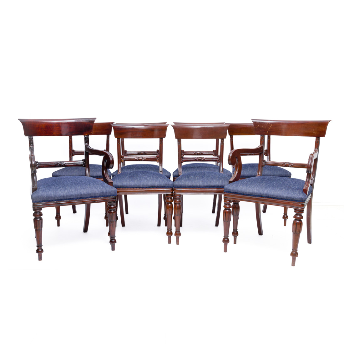 Em mogno e folheado a mogno, de tampo oval com duas tábuas de extensão, pernas caneladas e torneadas com rodízios, cadeiras de pernas frontais torneadas, assentos estofados. Pequenas falhas e defeitos. Dim.: 78x168x108 (fechada); 78x260x108 (aberta) cm.