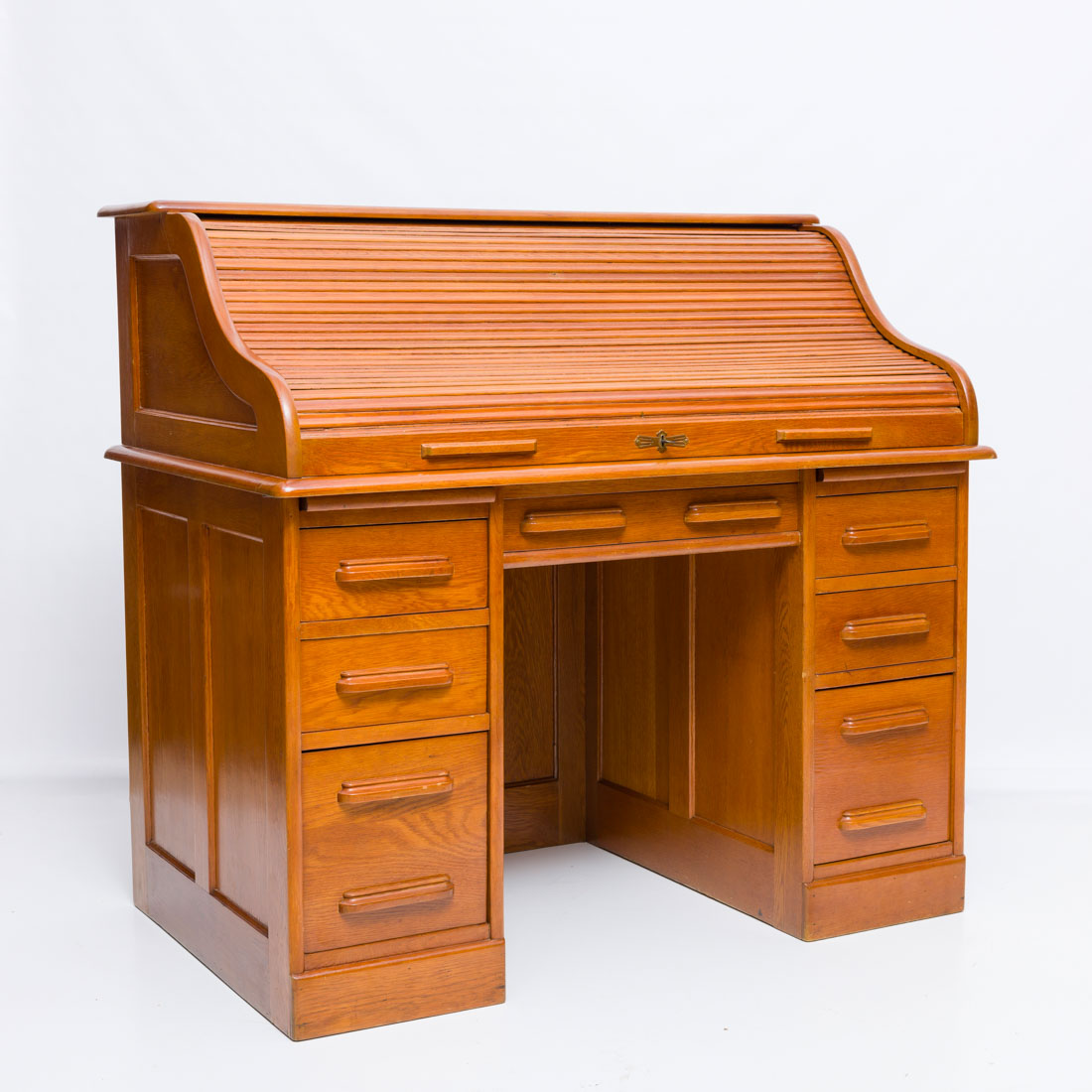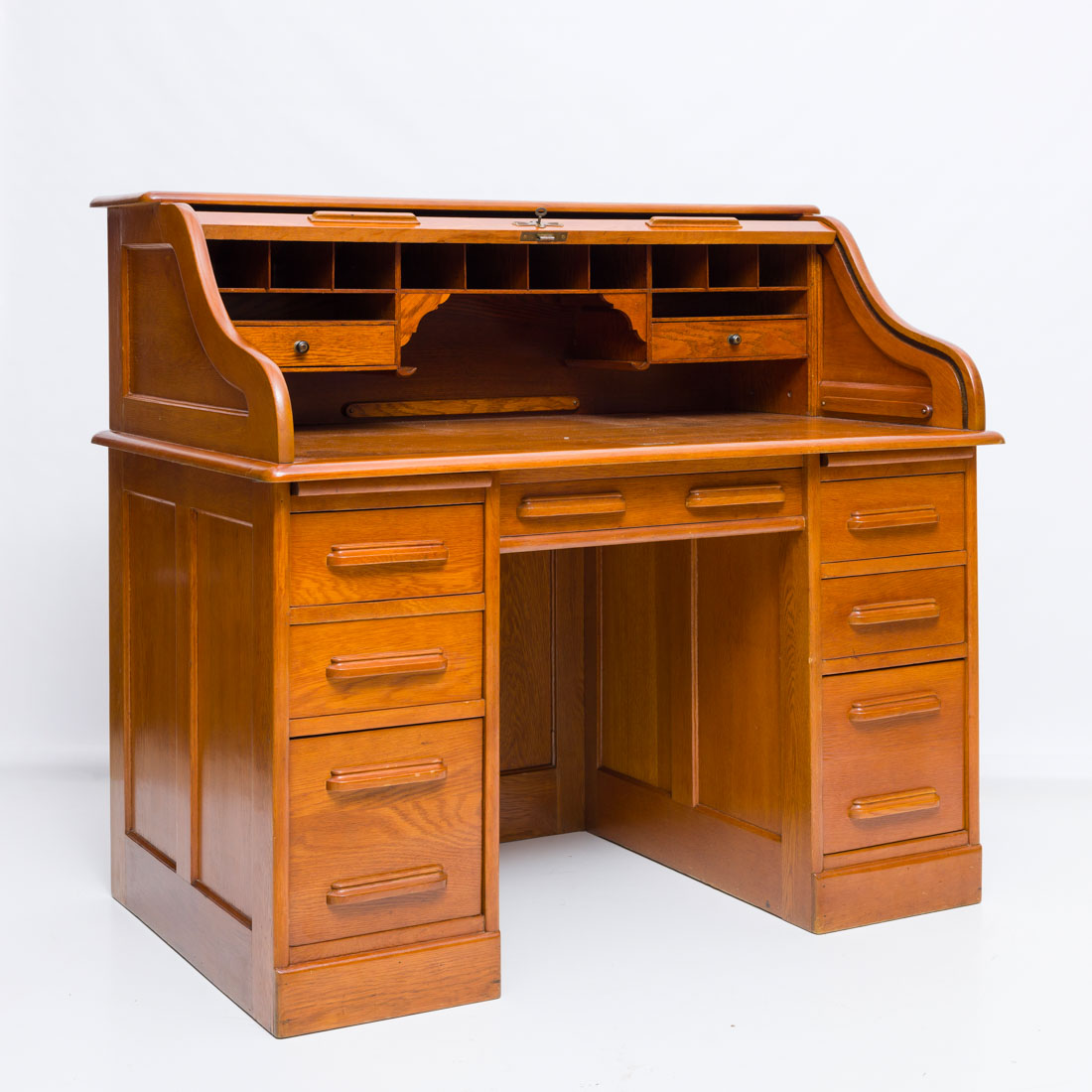 Em diferentes madeiras de sete gavetas, no interior escaninhos e pequenas gavetas. Pequenos defeitos e pequenos restauros.