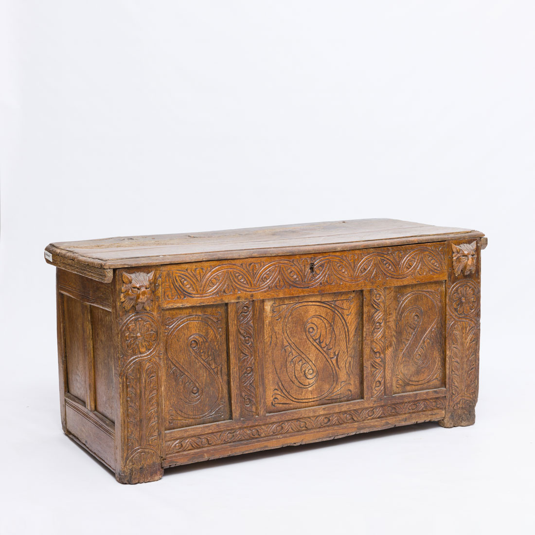 Em madeira, decoração incisa e entalhada com elementos geométricos e "cabeças de animais". Séc. XVII. Falhas e defeitos.