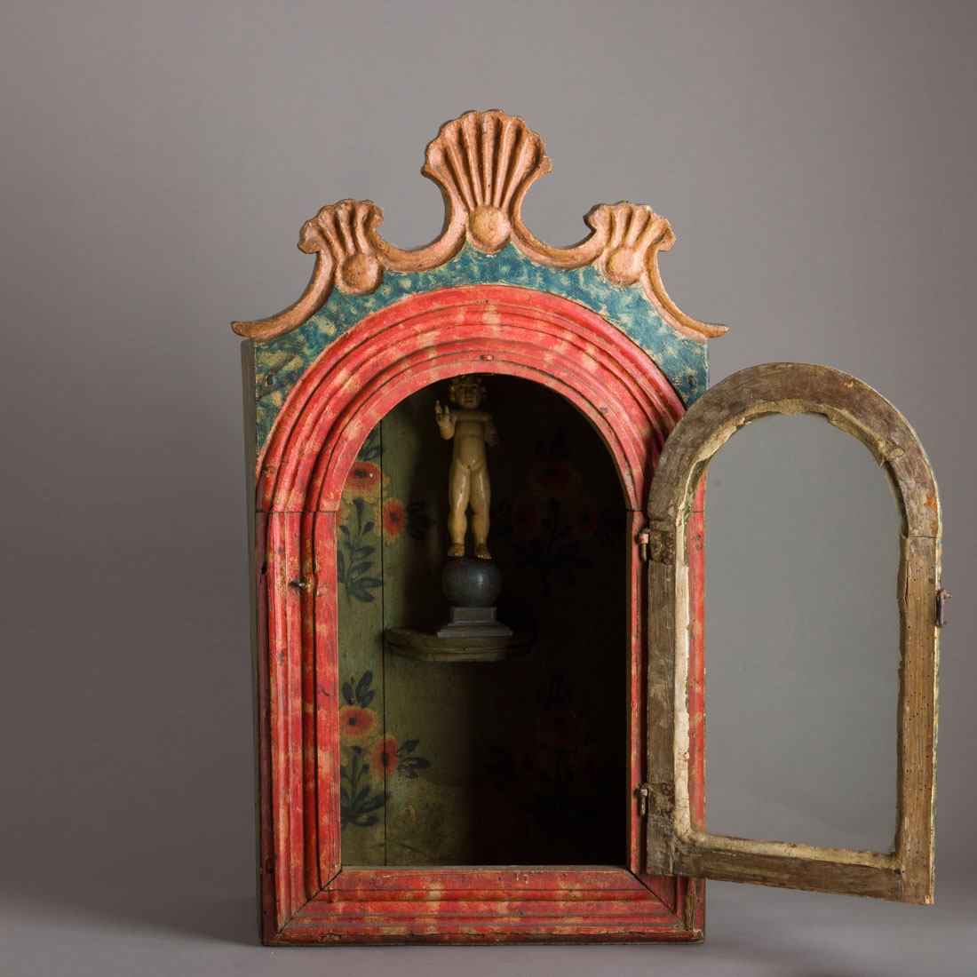 Em madeira pintada, decoração policromada e marmoreada, porta em vidro. Séc. XVII. Menino em madeira policromada e dourada (falhas e pés colados). Pequenas falhas, defeitos e vestígio de xilófagos.