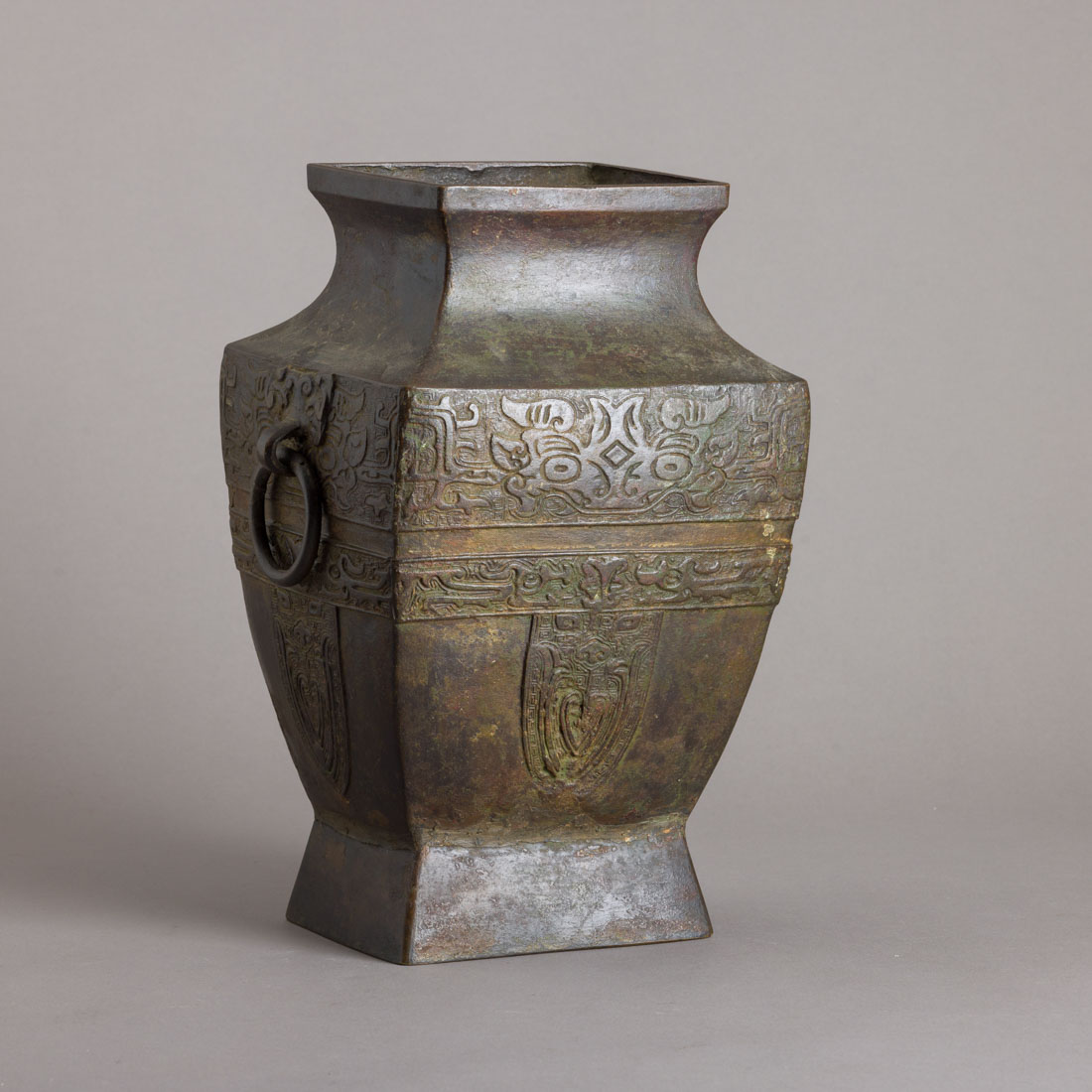 Em bronze, decoração relevada e gravada, pegas com argolas. Pequenas falhas e defeitos.