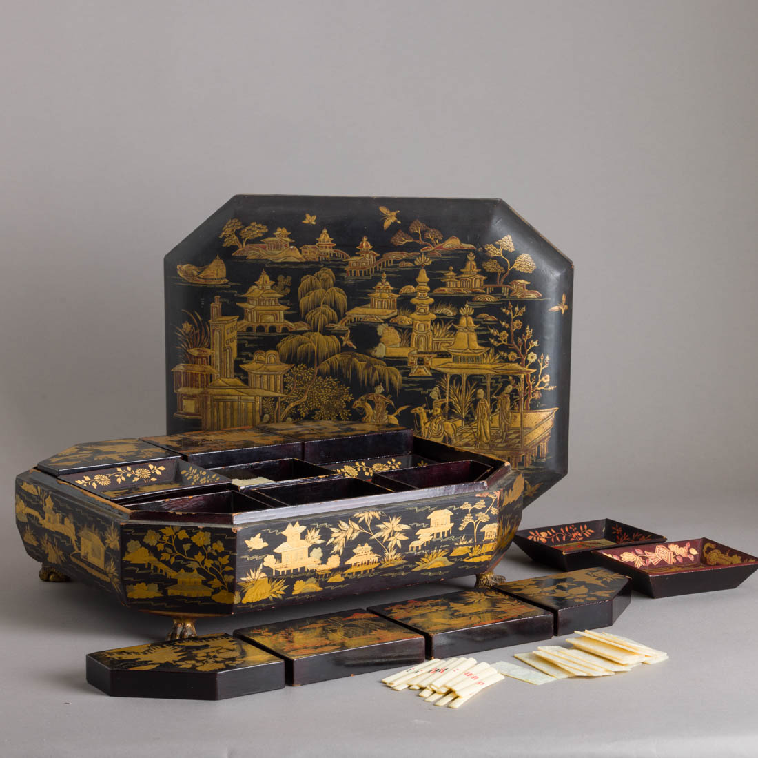 Em madeira lacada de negro, decoração a dourado "Chinoiseries", interior compartimentado com caixas, bandejas e dezenas de fichas em madrepérola gravada e vazada de diferentes modelos e decorações, pés entalhados. Séc. XIX. Sinais de uso e falhas bordos.Dim:14x38x31,5 cm.