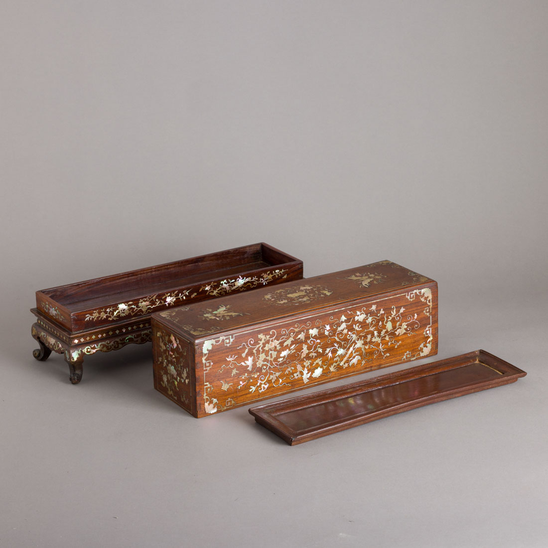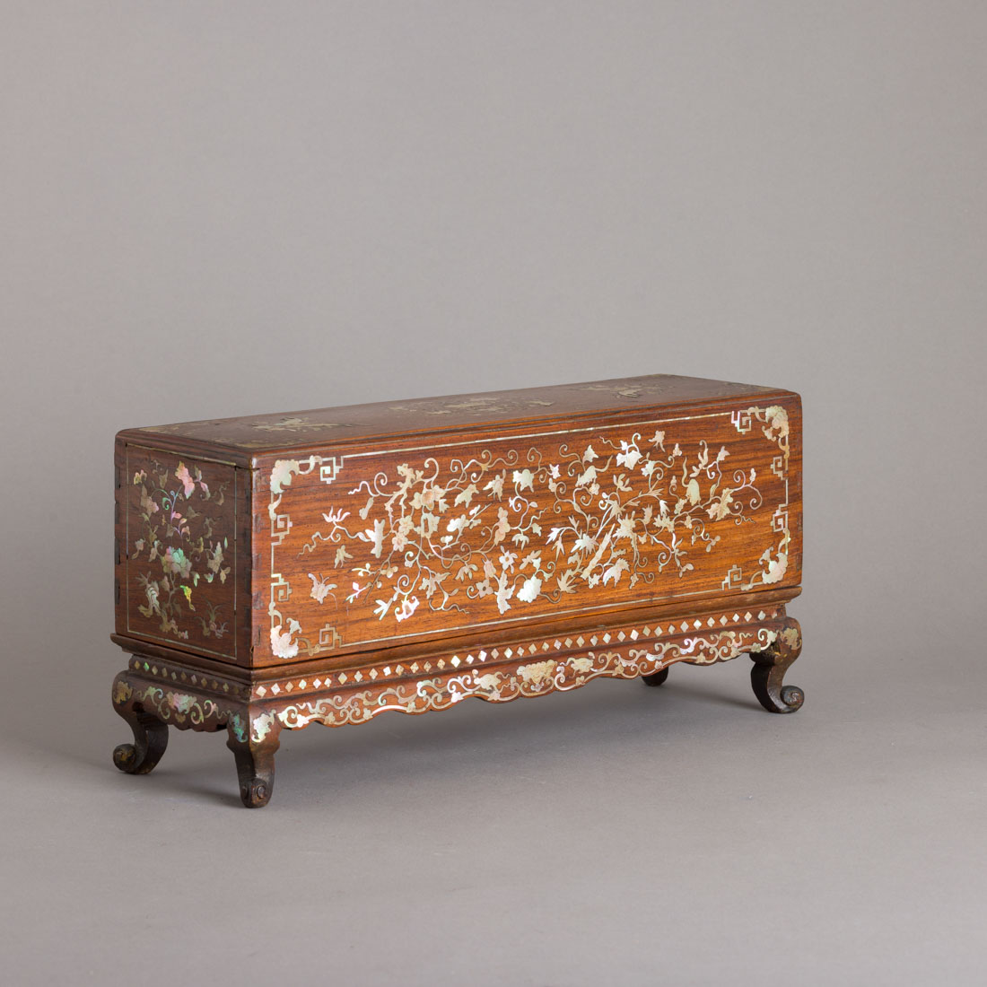 Em madeira exótica com embutidos em madrepérola "flores, borboletas, animais e caracteres". Chinesa, Séc. XIX. Sinais de uso e pequenas falhas.