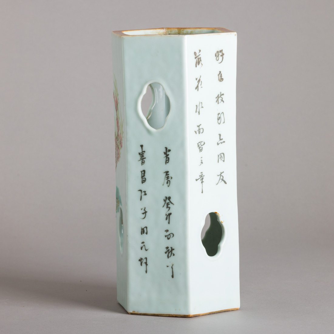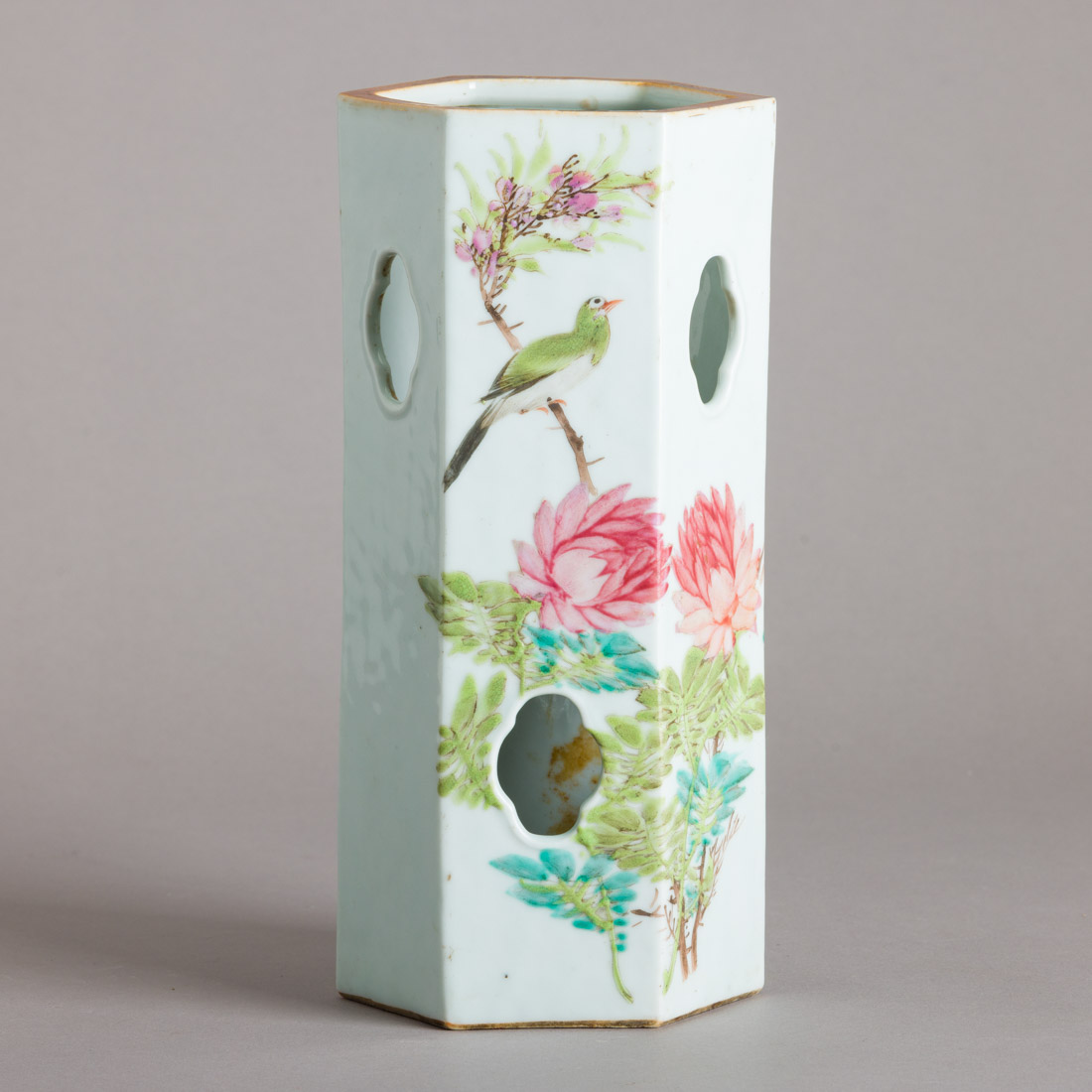 Em porcelana da China, decoração policromada "flores e pássaro", caracteres. Marcada. Sinais de uso.