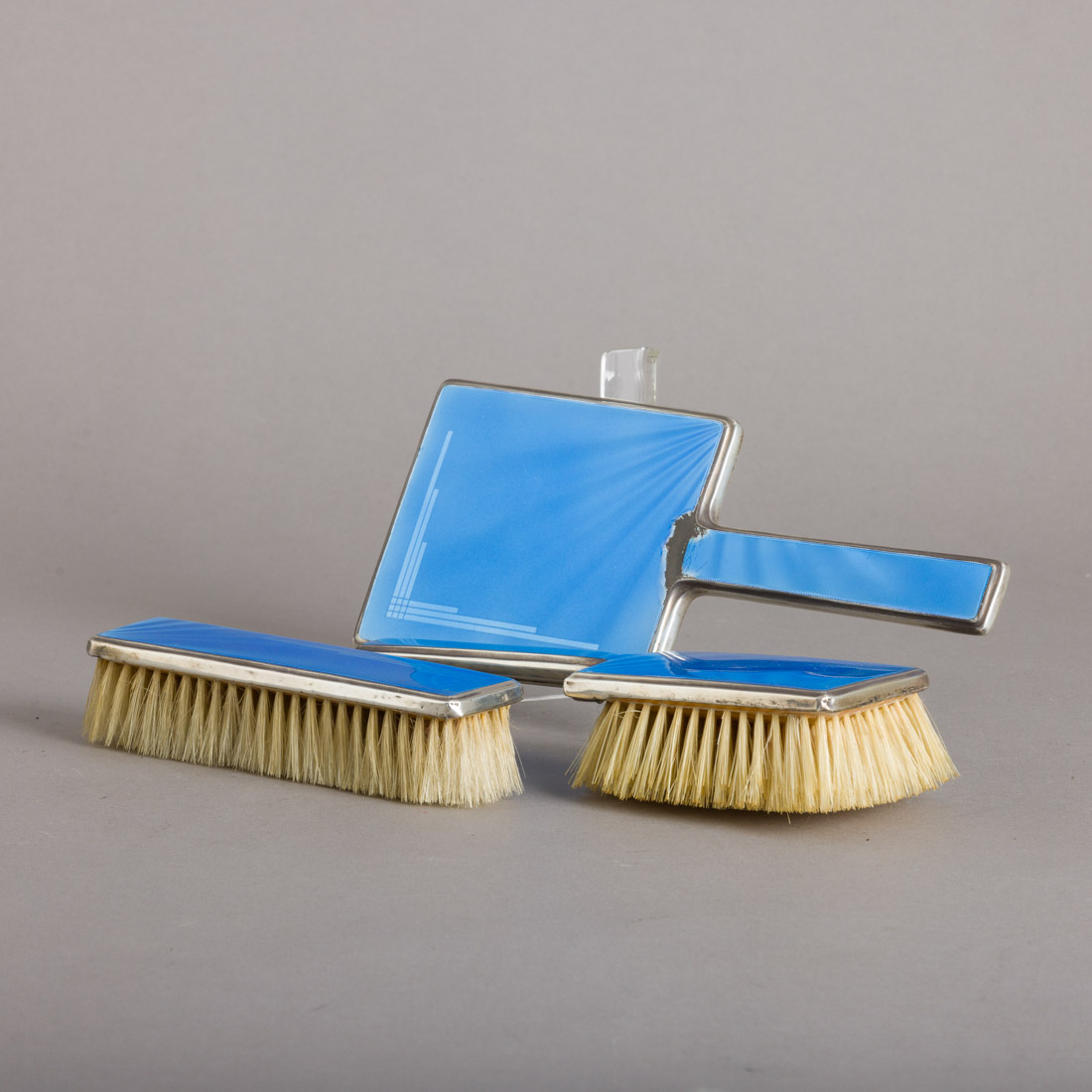 Em prata inglesa marcas de garantia da cidade de Birmingham (1937) e esmalte azul. Composto por duas escovas e espelho de mão. Sem marcas portuguesas, ao abrigo do Decreto-Lei n.º 120/2017. Amolgadelas e defeitos no esmalte.