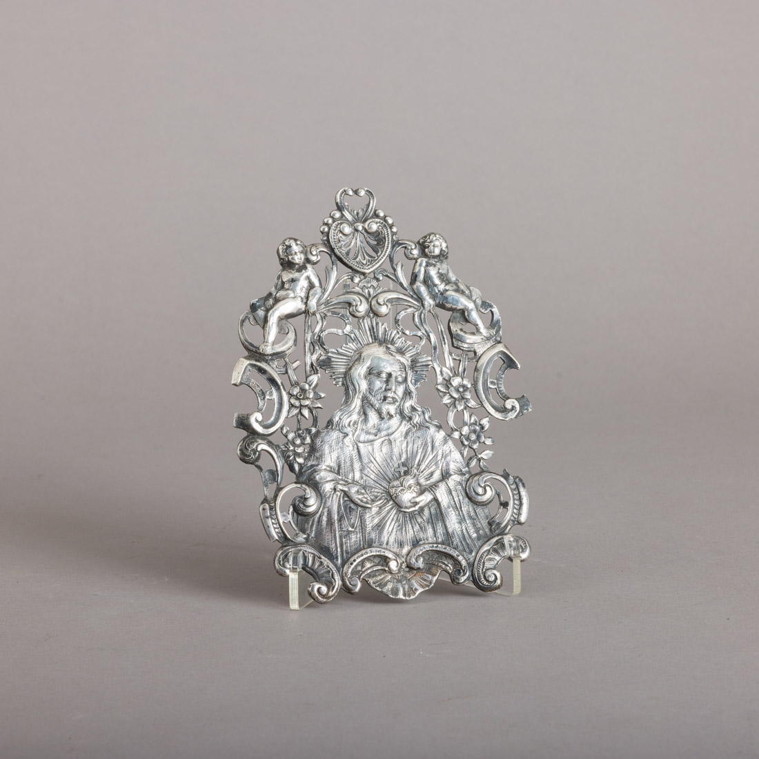 Em prata, decoração relevada e vazada. Sem marcas, ao abrigo do Decreto-Lei n.º 120/2017. Sinais de uso, falha.