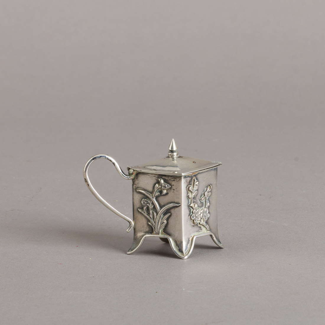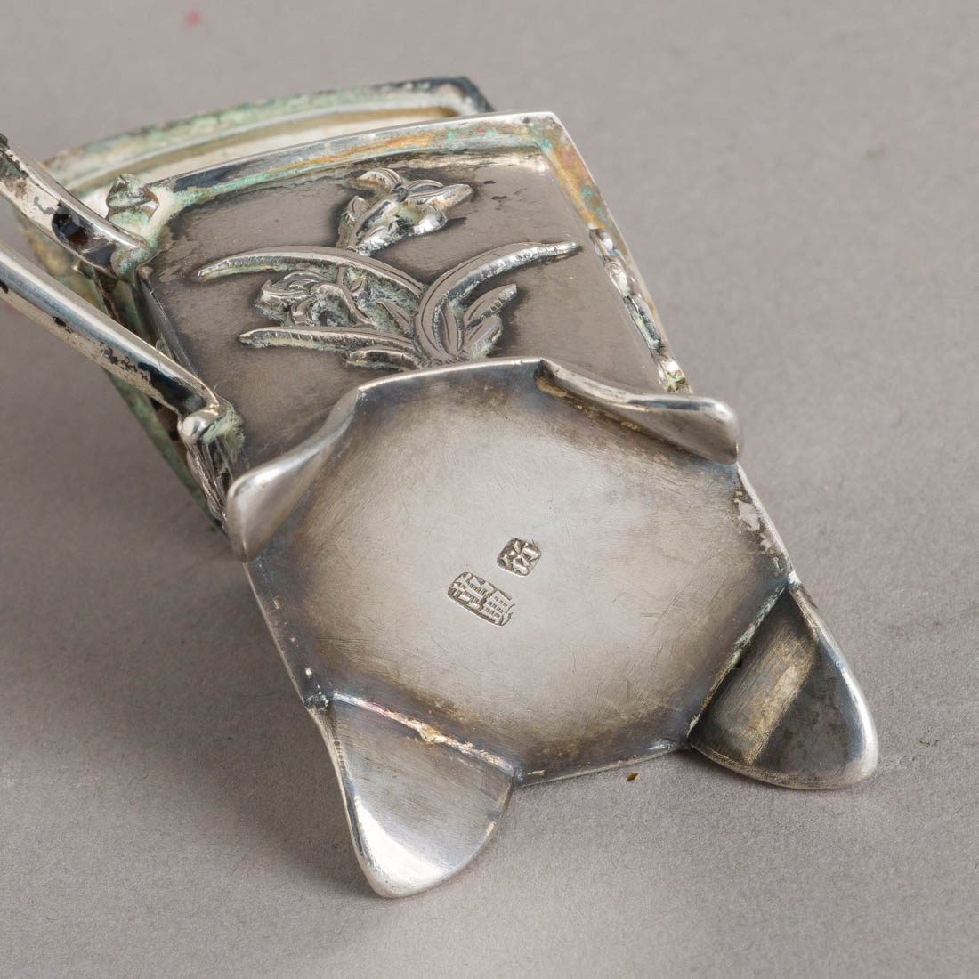 Em prata chinesa com marcas de garantia, decoração relevada "flores". Sem marcas portuguesas, ao abrigo do Decreto-Lei n.º 120/2017. Sinais de uso, defeito na dobradiça.
