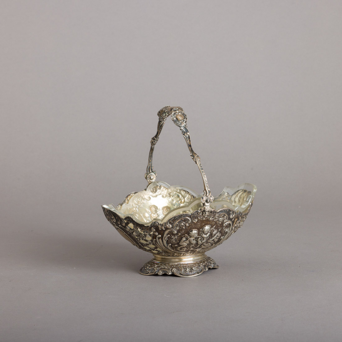 Em prata alemã de 800, marcas de garantia de teor, decoração relevada e vazada "flores e cupidos", interior em vidro recortado. Sem marcas portuguesas, ao abrigo do Decreto-Lei n.º 120/2017. Sinais de uso. Peso aprox.: 210 g. (só prata) Dim.: 17x17x16 cm.