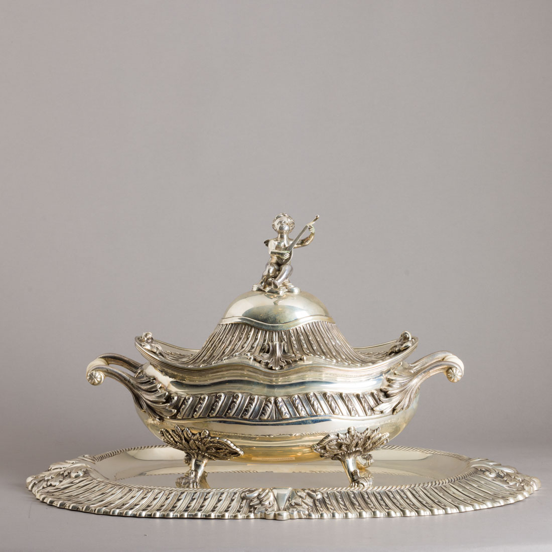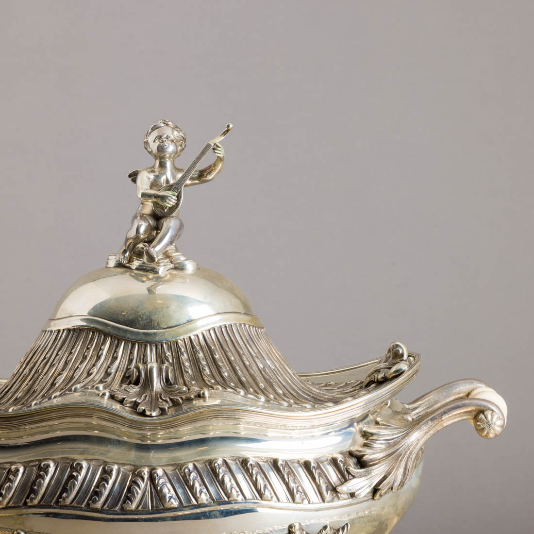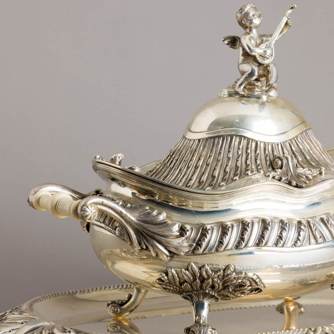 Em prata portuguesa contraste águia (pós 1985) de 835, marca de ourives Manuel Alcino & Filhos Ld.ª (reg.1986) marcada 925, decoração relevada com elementos vegetalistas, pomo "Querubim músico", asas em marfim torneado. Sinais de uso.