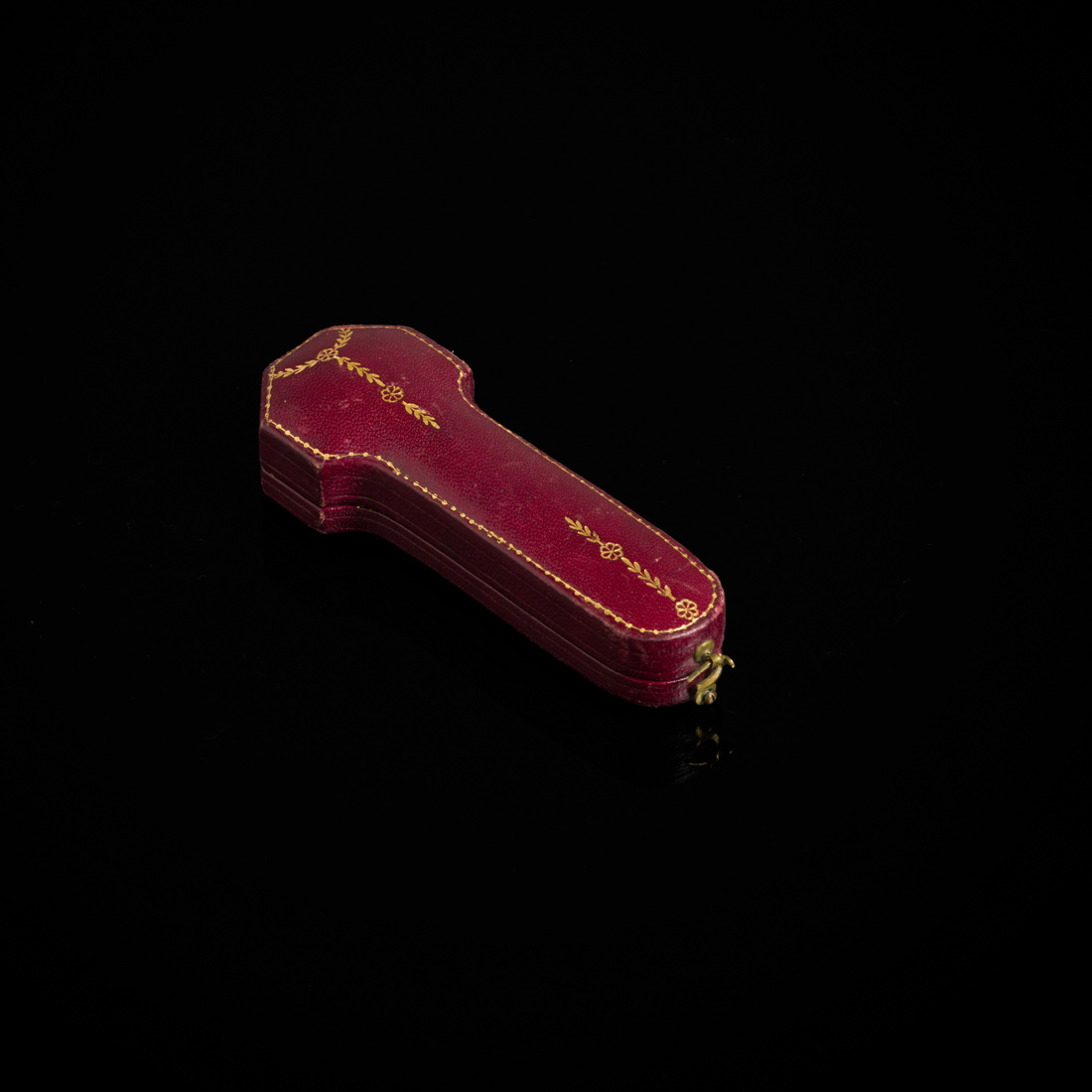 Em ouro cravejado com madrepérola. Sem marcas, ao abrigo do Decreto-Lei n.º 120/2017. Ligeiras amolgadelas. Com estojo marcado José Rosas & Cª. Sinais de uso.