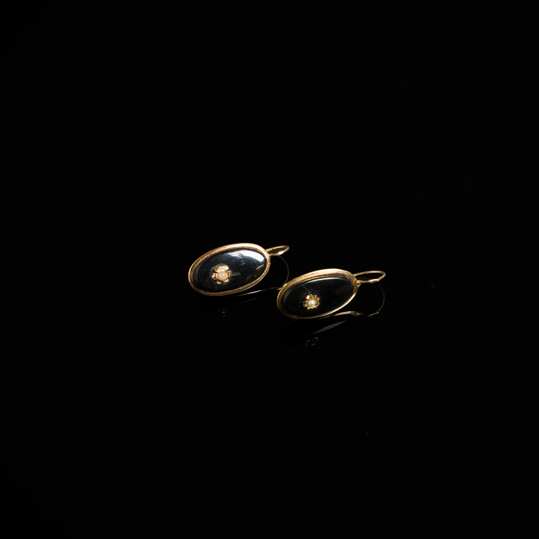 Em ouro português de 19,2Kt., contraste veado (pós 1985) cravejado com azeviche e meia pérola. Sinais de uso.