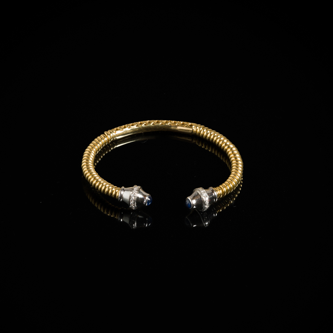 Em ouro bicolor, decoração relevada e vazada, extremidades cravejadas com diamantes em talhe de brilhante e duas safiras em talhe cabochon. Sem marcas, ao abrigo do Decreto-Lei n.º 120/2017. sinais de uso.