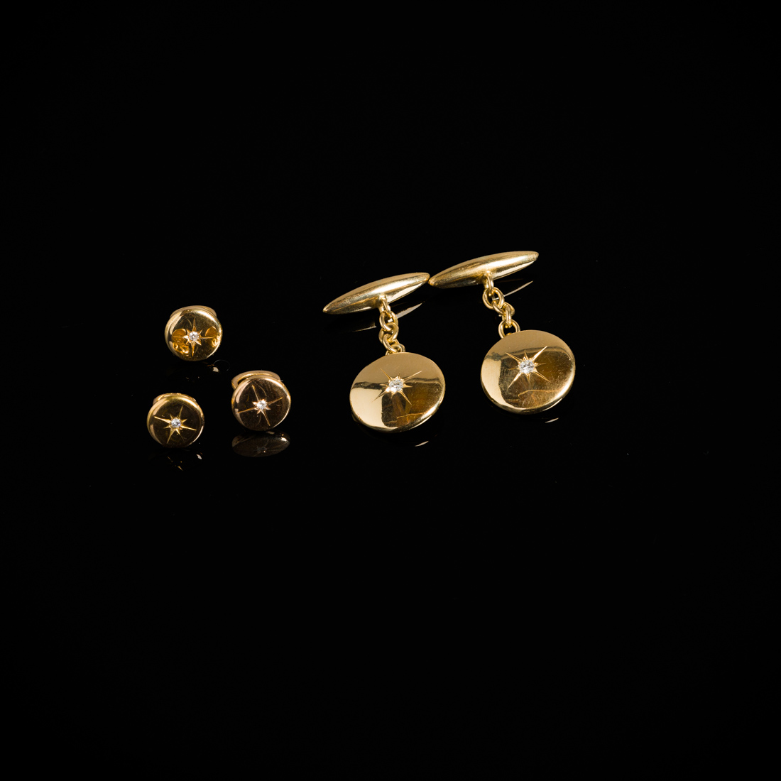 Em ouro português de 19.2Kt., cravejado com diamantes em talhe de brilhante, par de abotoaduras contraste tigre (1887-1937), os restantes sem marcas, ao abrigo do Decreto-Lei n.º 120/2017. Sinais de uso.