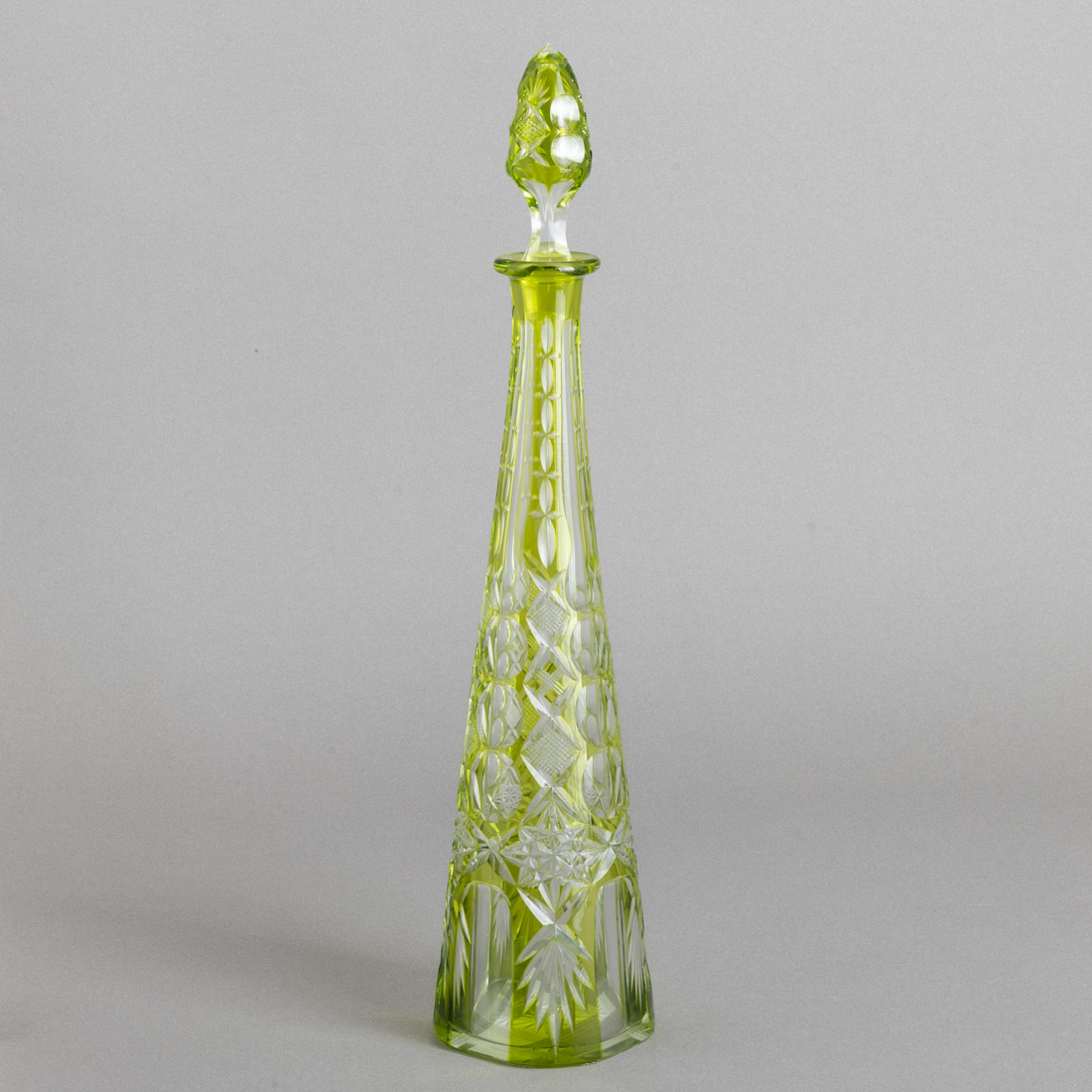 Em cristal bicolor, decoração moldada e lapidada. Sinais de uso, pequeno defeito de fabrico, ponta da tampa com defeito e esbeiçadelas.