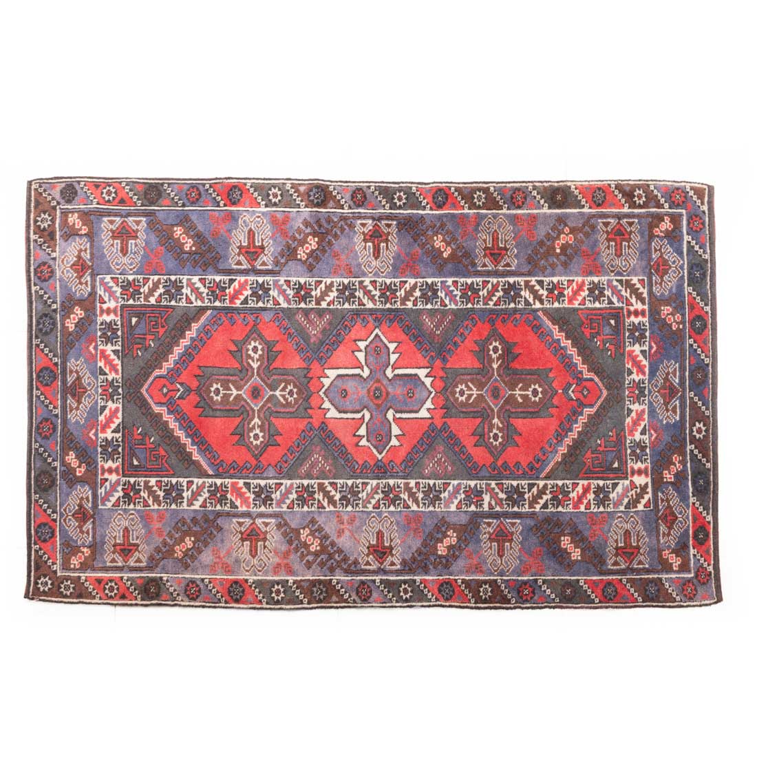 Em pura lã, decoração policromada com elementos geométricos. Sinais de uso e pequenos defeitos.