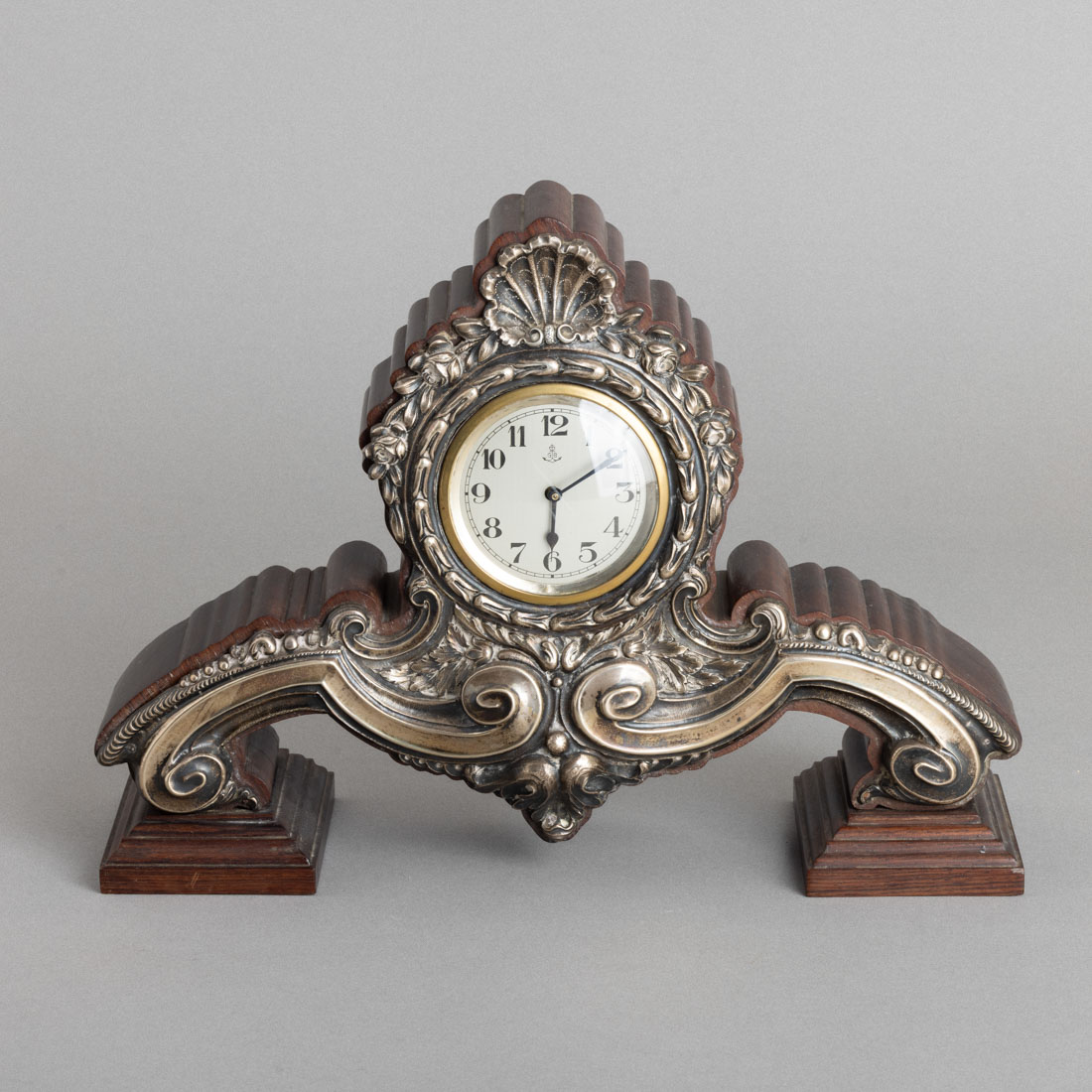 Em pau santo, aplicações em prata portuguesa contraste javali (1887-1937) de 833, decoração relevada "elementos vegetalistas, enrolamentos e concheado". Movimento mecânico de corda. Sinais de uso, pé levemente solto e não funciona. Dim.: 22x30x9 cm.
