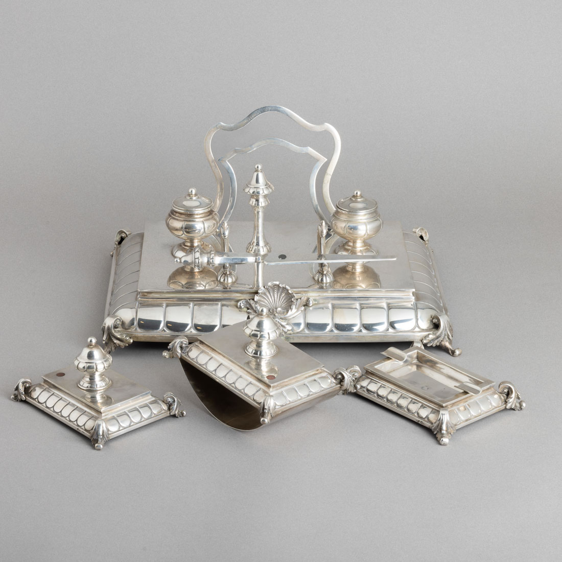 Em prata portuguesa contraste águia (1938-1984) de 833 marcada Topázio, decoração relevada. Composto por escrivaninha, pisa papéis, mata borrões, cinzeiro, faca abre cartas e sinete. Sinais de uso, tampa do tinteiro solta e vidros com ínfimas esbeiçadelas. Peso aprox.: 2945 g. (só prata)